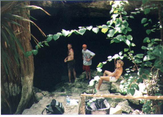 That night we took a taxi into Playa del Carmen to do some shopping. Erin said this was her favorite part of the vacation. I was there a few years ago and the atmosphere has really changed since then. Three years ago it was more market-like and you could bargain with the vendors. Now it is all souvenir shops and much less interesting. The kids got their shopping done and Ben got a black henna tattoo on his upper arm. The tattoos and braided hair were the big fads there this year. On the taxi ride back to the resort there was a roadside stop we had to make due to "taxi unions." Ben definitely was not very comfortable with this unexpected stop. It was short, though, and they didn’t ask us to turn over our valuables. Our final excursion was the high point of the trip. Maybe low point, depending on your viewpoint. Across the highway from the resort entrance were a number of cenotes. Cenotes are deep, freshwater pools. They are good places to snorkel and see stalagmites and different varieties of fish. I asked at the front desk of the resort whether this would be worth a visit. She was lukewarm about the trip, but didn’t discourage me. She said the first one was about 25 pesos admittance fee and she didn’t know about the others further down. Relaxing and pretty were how she described them. We walked out the resort and across the highway to the first sign—an idyllic depiction of azure blue pools with Mayan ruins rising out of the background. It said the cenote was 500 m ahead. We walked down an old dirt road into a jungle to find our spot in paradise. Along the way we heard laughing and splashing. We peered over a barbed wire fence and saw a dozen children and adults jumping into a clear blue pool of water. It looked great. Another sign directed us forward toward our own refreshing pool. We finally rounded a bend and came upon a very large (empty) parking lot and a little shack. A monkey with a collar was swinging from the trees outside. There was a sign right outside that mapped out not one, but four cenotes. There was also a wild animal park in the middle. Wow! This was great. How were we so lucky to come upon a place with four cenotes instead of one? It was also 100 pesos admittance instead of 25, but hey, with four times the fun… The proprietress spoke no English, but with my little Spanish I was able to talk her into letting the kids in for half price. That was the only good thing about this excursion, I’m afraid. The first cenote was only a 1 minute walk into the jungle and down some rock stairs, into the mouth of a dark, dank cave…complete with bats. There was a light oily film floating on the water and a few tiny black fish. It was like swimming in a flooded basement. No way were any of us going into that.