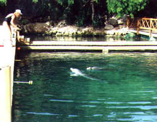 Our room was small, but adequate. They already had the extra rollaway bed in the room when we got there. The maids did interesting towel sculptures if you tipped them. They rolled and folded extra towels into shapes of swans and turtles, decorated them with fresh flowers, and left them on our turned-down beds. The buffets were the highlight of the trip. One child is a vegetarian and the other is a staunch meat-eater, but we didn’t hear a complaint from either one of them. We generally ate at the buffets for breakfast and dinner. Lunch was at one of the grills on the beach, which featured hamburgers, hotdogs, nachos and soft-serve ice cream. All drinks were free as long as domestic alcohol was used. There were taps for beer and wine in all the buffets and slush machines for daiquiris and pina coladas at the bars. A bottle of rum sat next to the machine so you could add as much as you like. The drinks were nice, but since we were lying on the beach all day, we didn’t abuse the privilege. There are two ala carte restaurants at the resort and we could eat at each one only one time during the week. El Agave was a Mexican restaurant featuring regional grilled specialties. Don Quixote was a Spanish restaurant, which was a nice change of pace although the kids weren’t as sure about some of the items there. I gave Ben one of my calamari rings, thinking he knew that it was squid. He didn’t much care for the thought of a chewy tentacle in his mouth, but he got it down. The beach was beautiful. It was about 2 miles long on a nice inlet, fine white sand and shimmering, warm turquoise waters. We were able to snorkel at a little reef in the swimming area or over by the boat dock. There were plenty of chairs on the beach and even a few palm trees to provide shade during the day. Topless sunbathers were not unusual. Erin wasn’t too impressed, but Ben never said a word about it. A couple mornings we played tennis, but it is very, very hot there, even at 9:00 a.m. There was also a pitch and putt golf course as well as miniature golf and a putting green. Ben enjoyed the golf. We did take a couple side-trips from the resort. One afternoon Tyler, Ben and I walked to Puerto Aventura, which is about 2 km from the resort entrance. It was hot and that walk took us about 50 minutes (because I just don’t walk as fast as I used to, I guess). Puerto Aventura has a Dolphin Encounter program which is smack in the middle of the business area. It was interesting to watch the trainers feed the dolphins. We stopped for a drink (most expensive Corona I’ve had anywhere!) and took a taxi back to the resort.