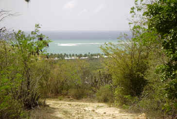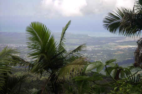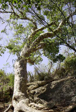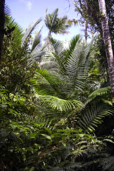 We stayed at the Hilton resort in Ponce on the south side of the island. Ponce was reported to have a great historic area. We thought Saturday night we might find a great restaurant, but the area was dead. On Sunday we decided to give it another try. Our travel book, the local entertainment magazine and even the signs next to the museums all said everything is open on Sundays. Everything was closed and the only people around were cops and a woman bumming cigarettes. I asked a cop why everything was closed. He looked at me in disbelief and said, "It's Sunday." When I said that everything indicated the museums and shops would be open, he just shrugged his shoulders. We decided to get out of town. Tyler really wanted to see the World's Largest Radio Telescope near Arecibo--straight north through the mountains--and this was his only chance. (If you've seen the movie "Contact", the telescope was shown right at the beginning.) Driving in Puerto Rico is a challenge. No matter which direction we headed, it would take at least an hour longer than it should have. I always had 4 maps spread across my lap and no 2 ever said the same thing. And none of them ever correlated with any road signs either. One way streets are not marked. Slow drivers do not stay to the right. Many of the roads wind around the edge of steep mountains. When drivers take curves on those winding roads, they make no attempt to stay in their own lane and come at you head on. To top it off, Tyler insists on taking pictures through the windshield while he's driving. When we returned the rental car, Tyler had to look on helplessly as I shredded all the maps with my bare hands. It took us an hour to get out of Ponce and even then we didn't find the "new 3 lane highway" that would take us straight to Arecibo. We were on one of those winding mountain roads at 20 mph with plenty of curves. We did finally get over to the new highway, which dramatically increased our speed. That is until it ended 5 miles down the road. Turns out the new highway was missing a big segment right in the middle. There was no way but the winding way. On the way back from Arecibo, we rounded a bend and were confronted with burning trees across the road. A few locals pulled some burning tree trunks off the highway, but they left the tops right out there in our lane. There were still some burning trunks suspended above our heads as they leaned against the cliff. Out my door were plenty of flames and in the other lane was a string of about 20 cars that had no intention of pausing a moment so we could get out of there. (Unfortunately, I have no pictures of this because I had my mind on other things.) Tyler finally got pushy and nosed his way into on-coming traffic so we would not be a sitting bomb. A few miles down the road he snickered and mocked me saying, " 'Holy shit.' You know, you sound just like your mother only you use different words." Puerto Rico may be US territory, but it has a flavor all its own. During our long drives, we stopped at the little "colmados" or roadside bars and tried all the local specialties. Here are some of the interesting dishes: Piononos--Coils of plantains, stuffed with meat, batter dipped and deep fried. Mofongo--Balls of mashed plantains with seafood or meat, deep fried Alcapurrias--Deep fried fritters Bacalaitos--Deep fried codfish fritters Tostones--Fried plantain chips Lechon Asado--Roast pork If you like plantains ( big, starchy bananas) and fried food, you'll love the local specialties. The redeeming feature of their diet is all the fresh fruit. I really like the tiny, sweet bananas--only 2" long and about as thick as my finger. The local beer is Medalla, which is about like a Coors. We tried Malta India, which is a non-alcoholic barley beverage. If you like drinking molasses, you'll love it. The ecosystems on the island are really diverse for such a small area. The south side is very dry, while the north is lush, green and tropical. One day we hiked through the dry forest near Guanica.